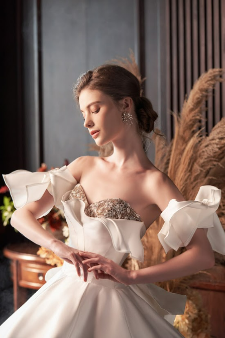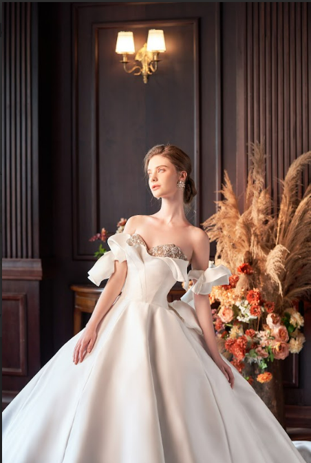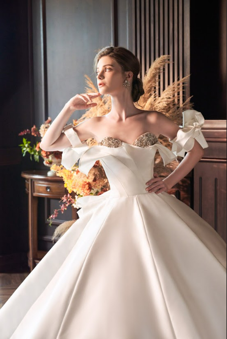 Made from luxurious Mikado and adorned with subtle beading, this ivory ballgown features a classic sweetheart neckline and elegant off-shoulder sleeves. The structured corset and flowing silhouette evoke timeless romance with a modern edge.