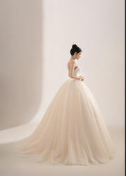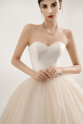 A stunning ball gown featuring a dramatic full tulle skirt in a soft ivory shade. The bodice is a clean, structured sweetheart strapless design in satin, offering a beautiful contrast. The back includes a classic corset lace-up closure, creating a timeless and majestic look.