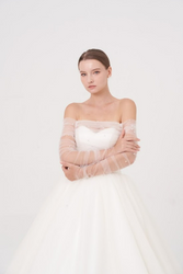 A dreamy ball gown featuring a full tulle skirt and a structured bodice. It is elevated by delicate off-the-shoulder sheer sleeves/gloves, adorned with scattered pearl embellishments. This majestic silhouette is perfect for a classic, romantic wedding.