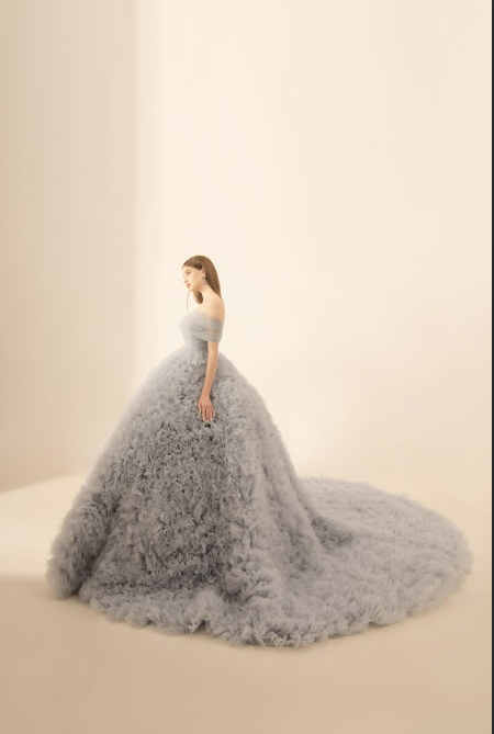 Dare to be different in this show-stopping purple-blue ballgown. Layers of cloud-like tulle create dramatic volume, while the semi-sweetheart neckline and sculpted corset keep the silhouette modern and refined. A dreamy statement piece for the bride who’s not afraid to turn heads.