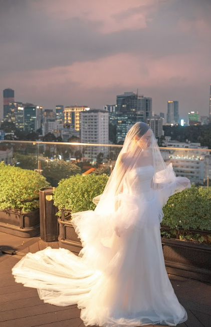 Designed for the modern bride, an off-white A-line gown features soft tulle, a flattering low waistline, and a structured corset for a beautifully defined silhouette. A timeless choice for an effortlessly elegant look.