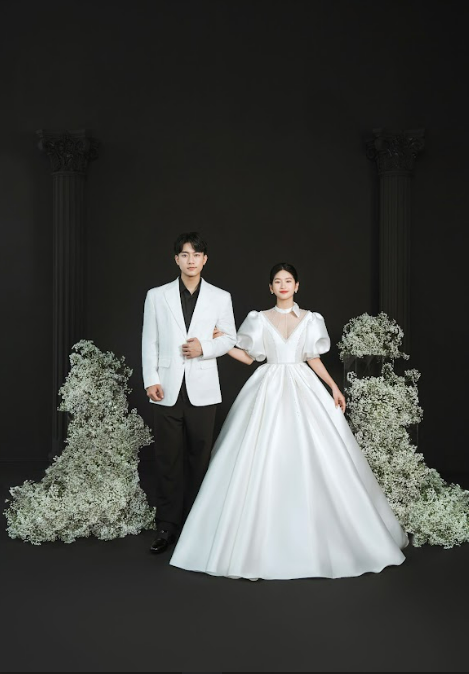 Majestic and elegant, this ballgown is crafted from lustrous fabric with a voluminous silhouette. The statement puff sleeves bring a touch of royal grandeur, while the sheer V-neckline with delicate embellishments adds a hint of modern sophistication. A perfect gown for brides seeking timeless elegance with a dramatic presence.