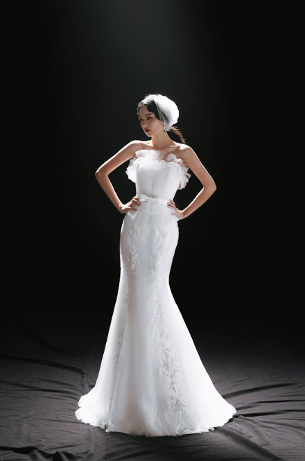 An ethereal gown with a strapless bodice adorned in soft tulle ruffles, cinched at the waist by a slender belt and subtle peplum. The skirt flows in a mermaid silhouette, embroidered with cascading floral lace appliqués. Paired with a gossamer headpiece, it creates a luminous, dreamlike bridal vision.