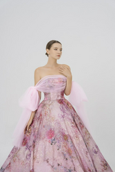 An enchanting ball gown in shimmering pink, adorned with multicolored floral patterns for a romantic, artistic charm. The strapless bodice is paired with a pastel pink tulle drape that softly wraps around the arms, while the voluminous skirt flows with fluid elegance. With its intricate floral detailing and fairytale aura, this gown perfectly blends romance, artistry, and timeless femininity.