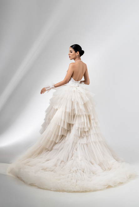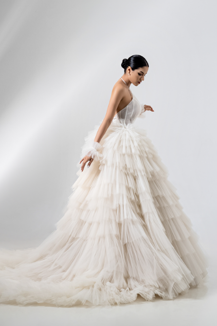 A halter-neck ball gown in cascading soft tulle, blending modern elegance with whimsical romance. The sheer pleated bodice flows into a voluminous tiered skirt with dramatic movement, while the open back and layered train add ethereal allure—perfect for a timeless yet fashion-forward bridal statement.