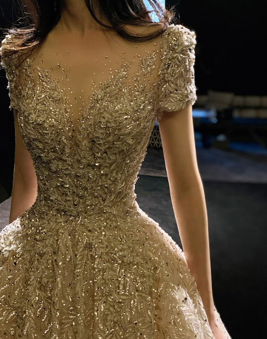 A champagne-toned gown with delicate short sleeves and a plunging illusion neckline, richly decorated with shimmering beadwork and embroidered leaf motifs. The full A-line skirt flows elegantly with a luminous texture, radiating sophistication and a subtle romantic charm.