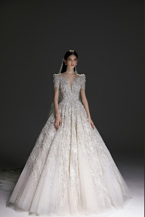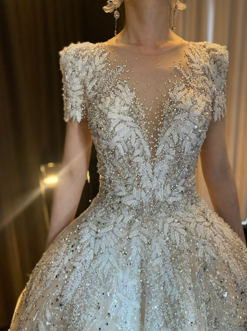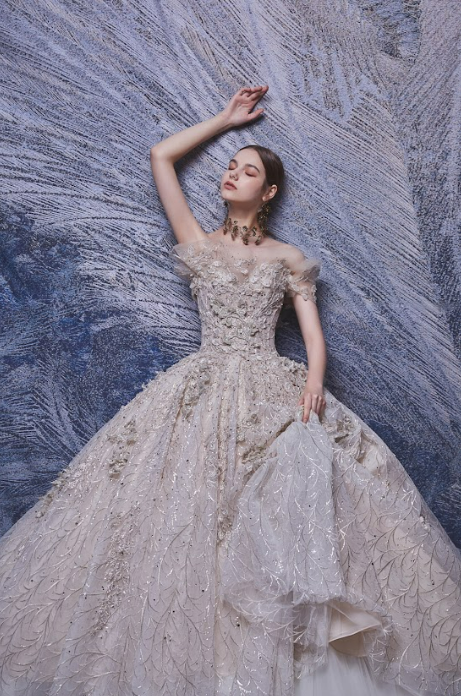 An opulent ball gown with an off-the-shoulder illusion neckline and sheer sleeves, adorned with three-dimensional floral appliqués and shimmering beadwork. The skirt flows with delicate embroidered patterns resembling cascading leaves, creating a sense of natural elegance and royal grandeur.