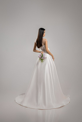 A gown that whispers of modern romance, its satin surface gleaming like liquid moonlight. The sweetheart bodice blooms with a sculpted bow, asymmetrically draped across the chest, a statement of grace and playfulness. A sheer illusion neckline hovers delicately at the shoulders, softening its bold lines, while the A-line skirt flows effortlessly into a gentle train. Every fold carries the quiet promise of beauty—elegant yet daring, timeless yet refreshingly new.