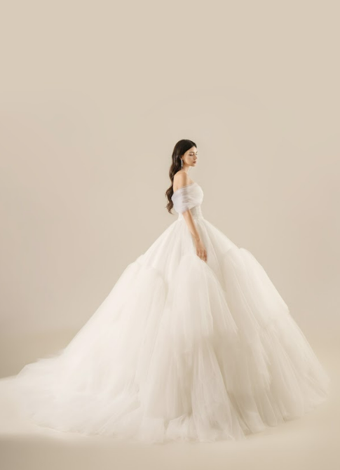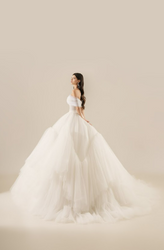 Sculpted in soft off-white tulle, this ballgown features a dreamy dual-tone overskirt that moves like light. The detachable bolero offers two looks in one — ethereal off-shoulder or sleek and structured. A modern romantic silhouette for the fashion- forward bride.
