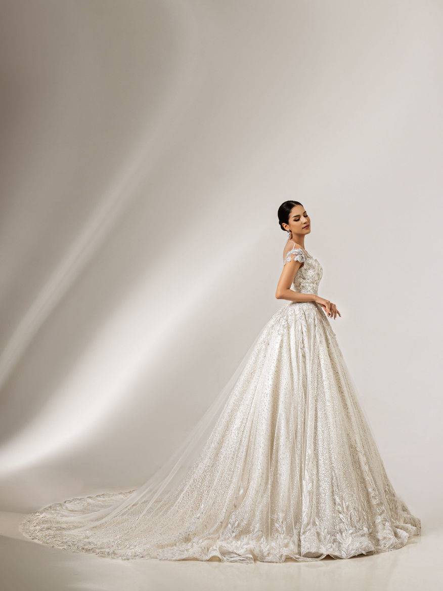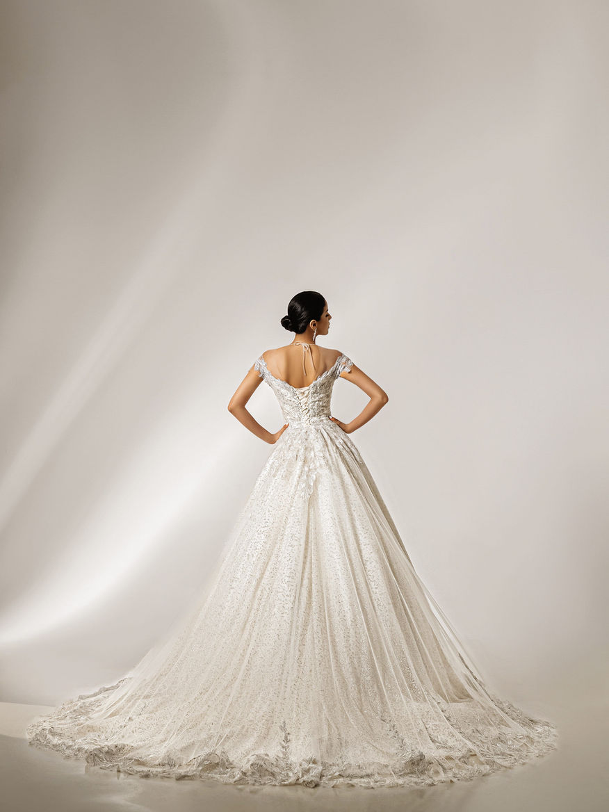 A silver ballgown with delicate beading. The illusion neckline with cap sleeves highlights refined details, while the natural waistline flows into a voluminous skirt. A luxurious and elegant design.