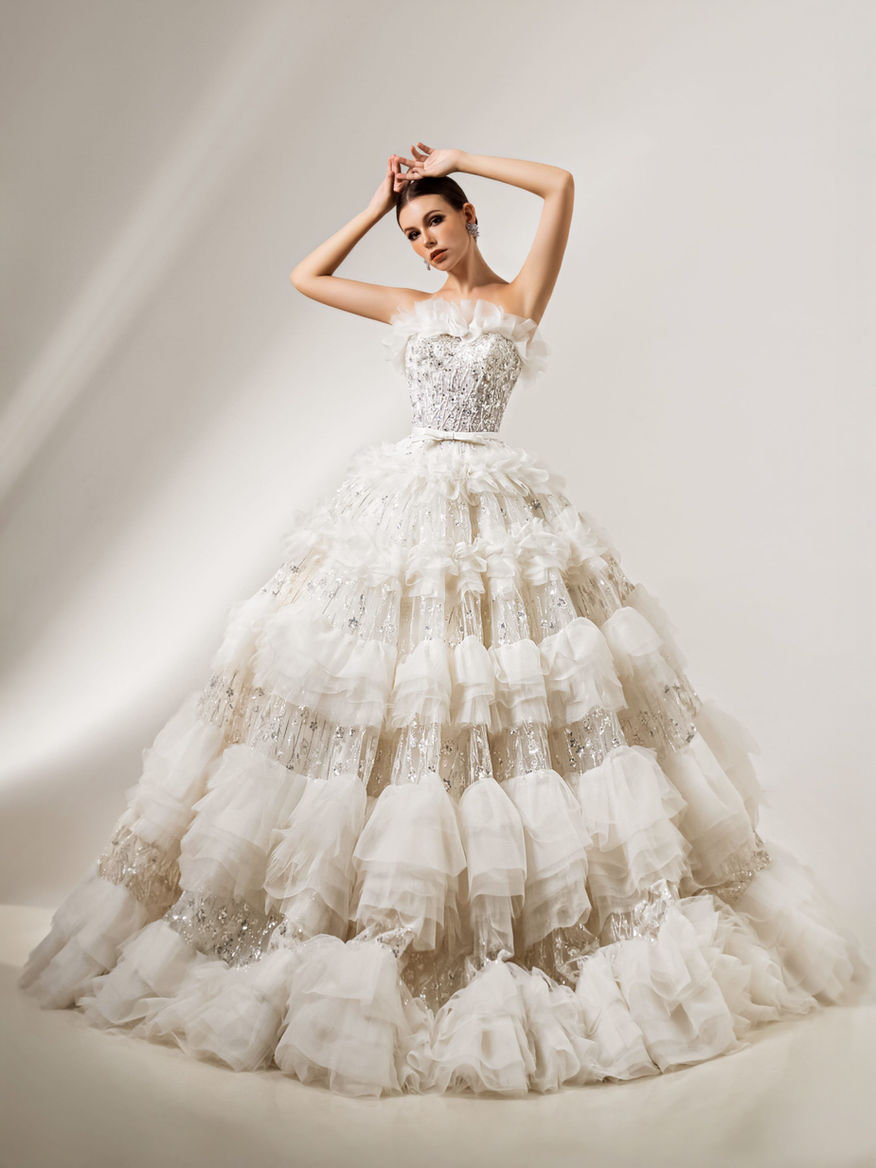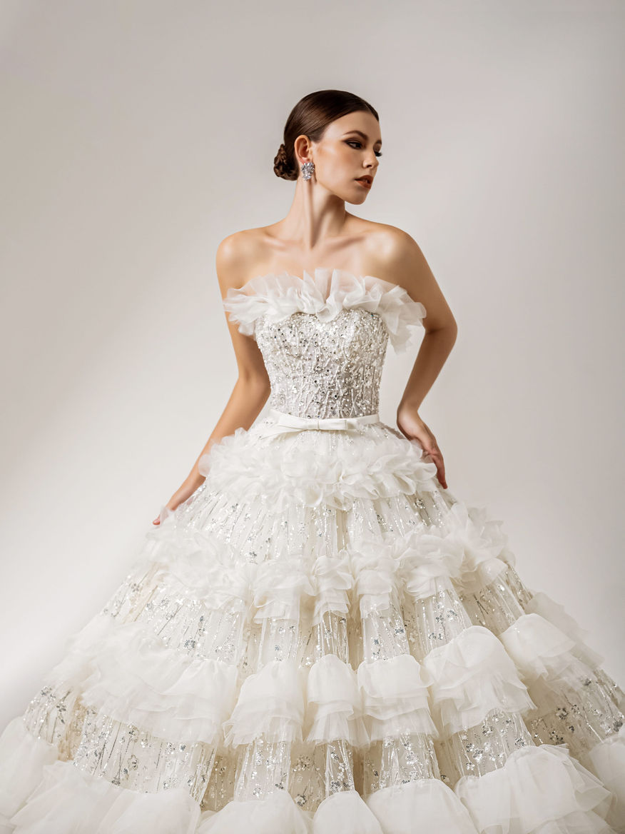 A dazzling strapless ball gown with a ruffled neckline, intricately beaded bodice, and voluminous tiered skirt. Layers of tulle and shimmering sequins create a fairytale radiance and regal elegance.
